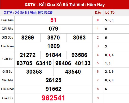 Tổng quan kết quả xổ số Trà Vinh ngày 16/1/2026